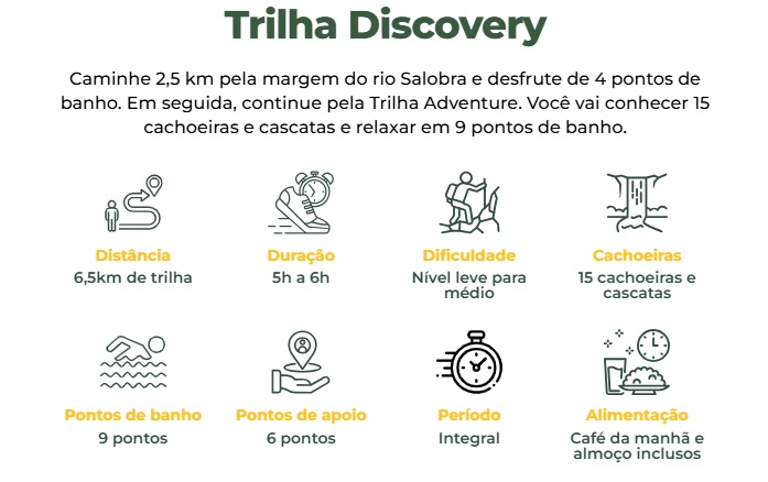 A Trilha Adventure tem 4 km de extensão, passa por 8 cachoeiras e tem 5 pontos de banho, com duração média de 4-5 horas. Já a Trilha Discovery é mais completa, com 6,5 km, 15 cachoeiras e 8 pontos de banho, durando cerca de 6 horas. A Discovery é mais exigente fisicamente, mas oferece uma experiência mais imersiva na natureza.